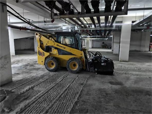 项目启动后,山推技术团队为客户量身推荐了SSL75V-M滑移装载机,配置快换铣刨鼓及清扫器等属具。面对地库内2.1米的高度限制,SSL75V-M整机高度仅2065mm,转向灵活,在狭小空间内表现出色;配套的大流量属具液压系统,保障了铣刨鼓的动力输出,在硬质水泥地面也能高效作业,日均铣刨面积可达1000㎡,施工效率提升75%以上。